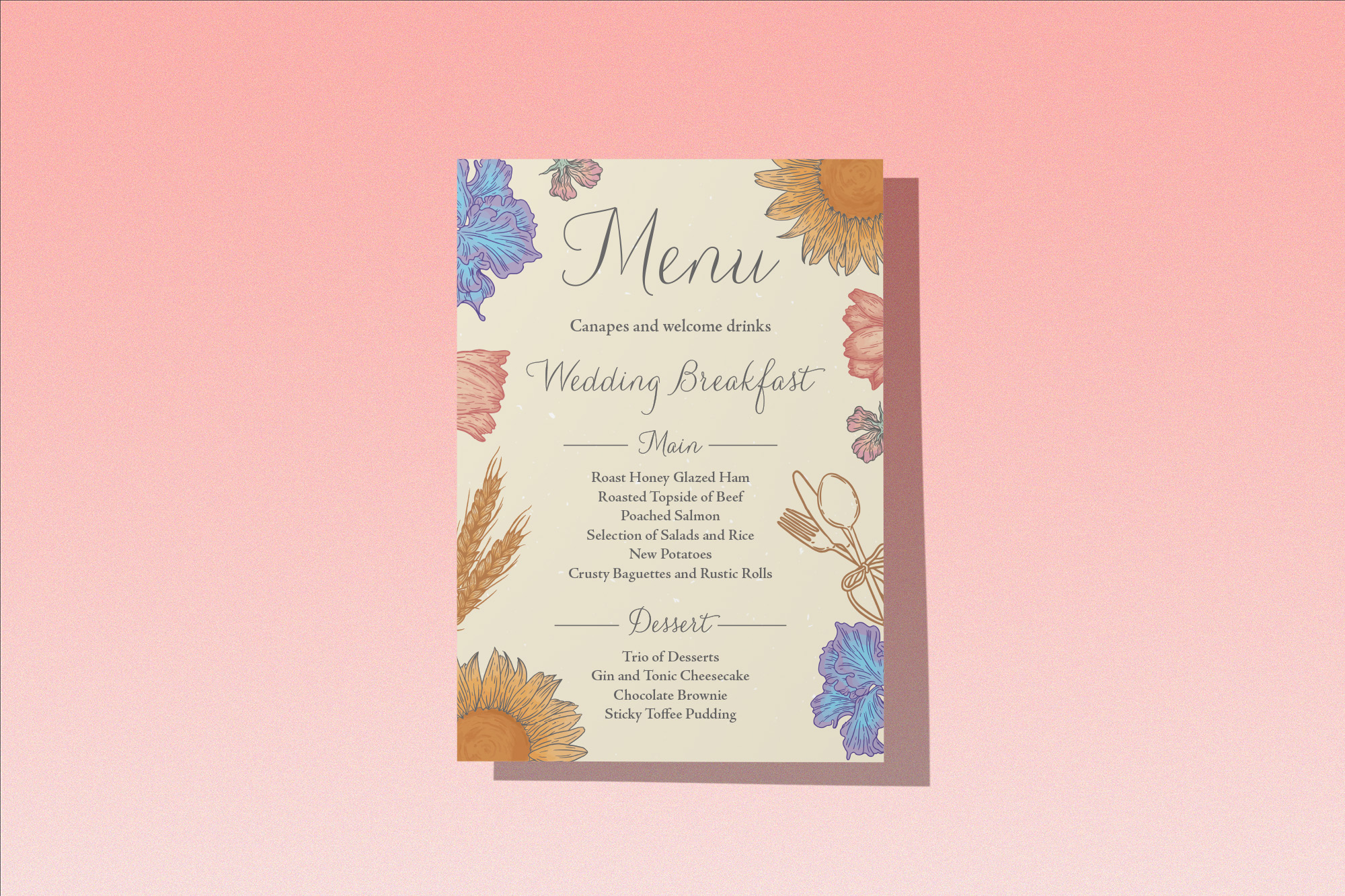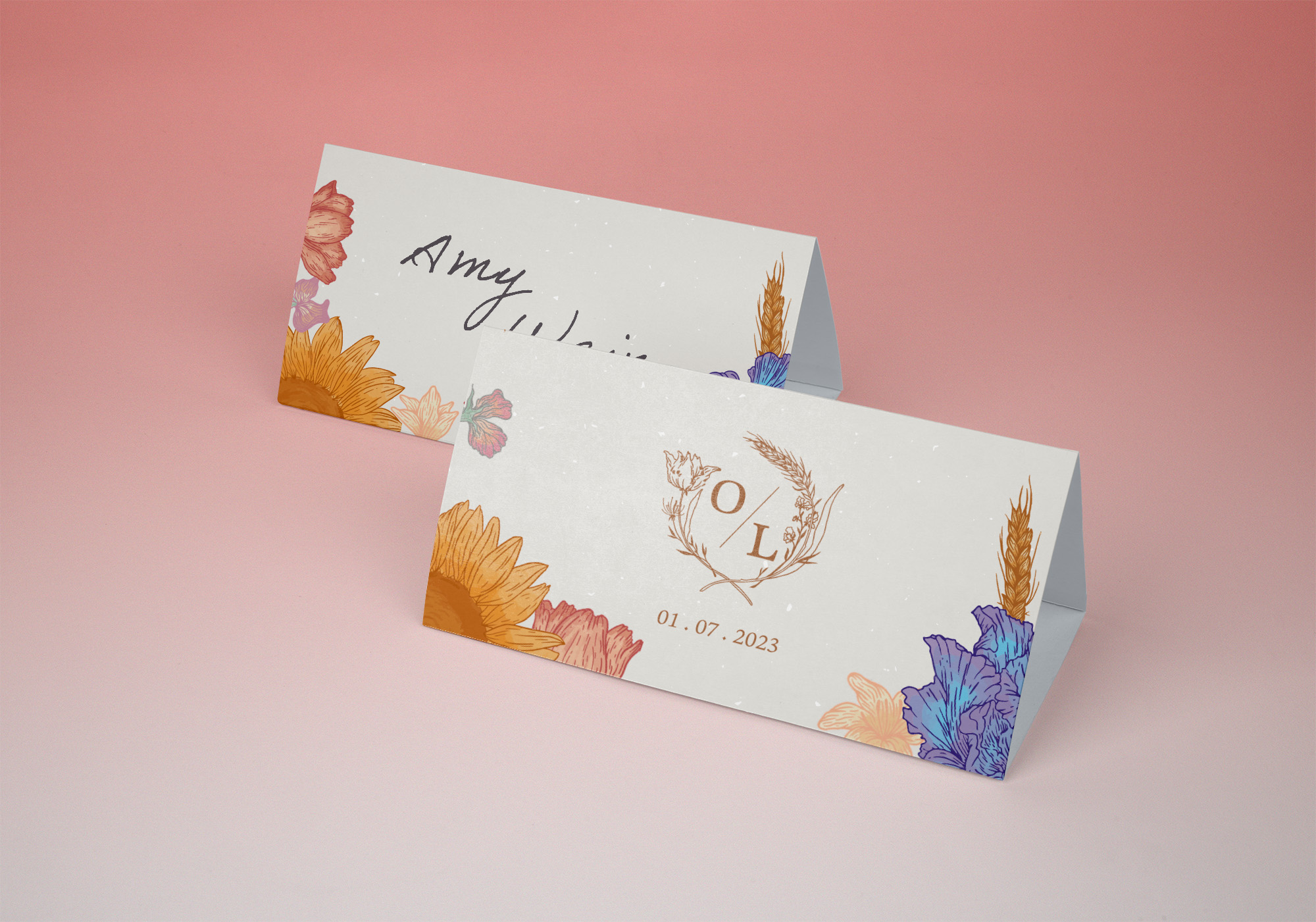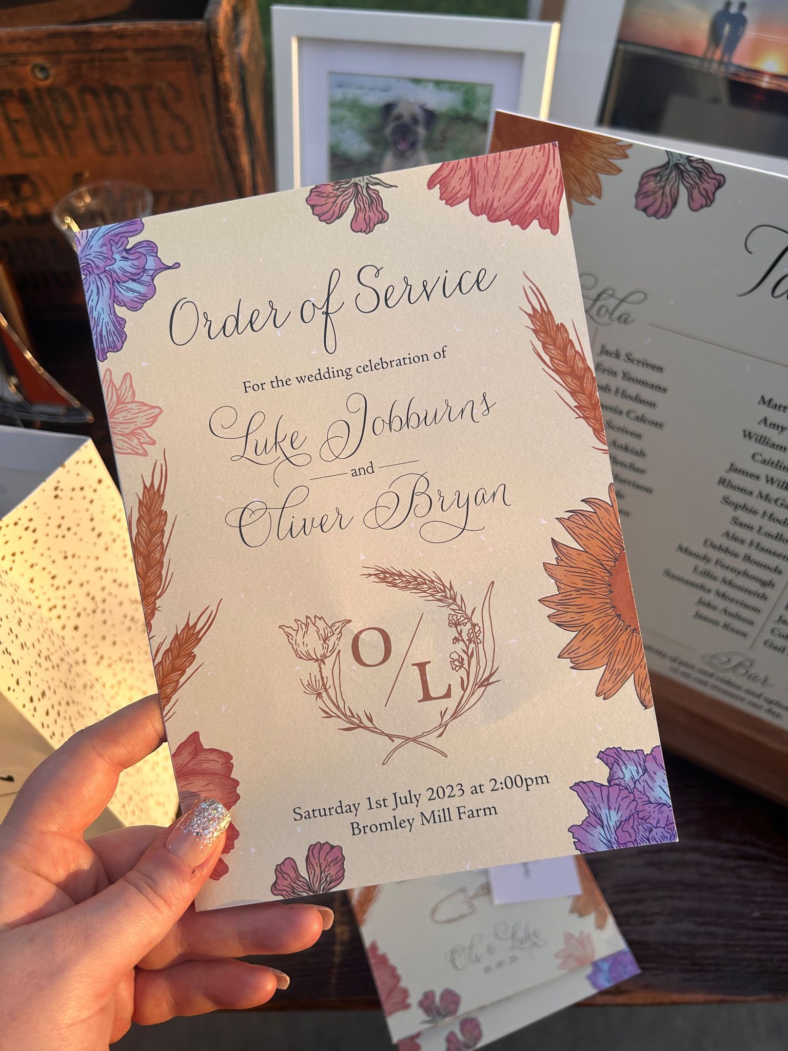 From day one we discussed and explored all options, taking inspiration from every aspect of the wedding plans. Colours from the flowers influenced the overall design and their personalities decided the illustrations, resulting in a truly bespoke, intimate and unique outcome.
